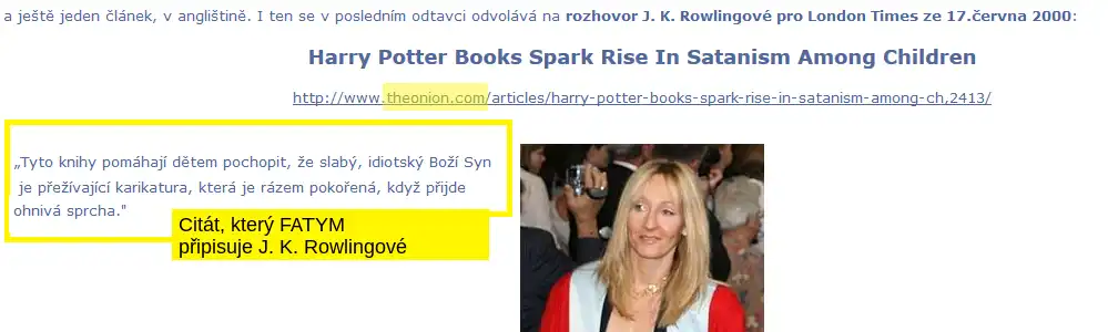 Kuriozitou je pak článek na webu katolického FATYMu, který mezi hypertextovými odkazy na weby dokazující ďábelský původ čarodějnické ságy vložil i link na jeden psaný „v anglištině“. V něm údajně nalezneme útržek rozhovoru, v němž se Rowlingová explicitně hlásí k satanismu a posmívá se Ježíši Kristu.